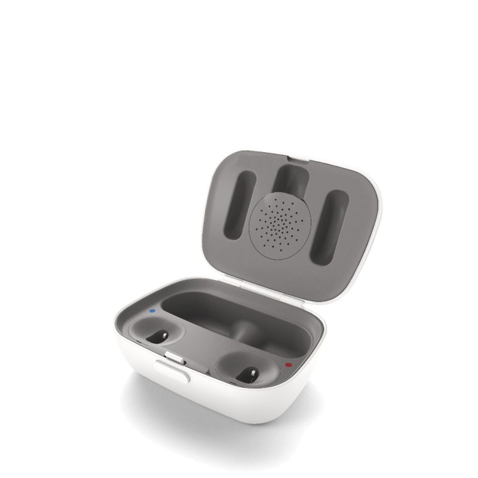 This newly designed charger features a magnetic pull insertion, making it easier for clients to insert and remove their hearing aids.